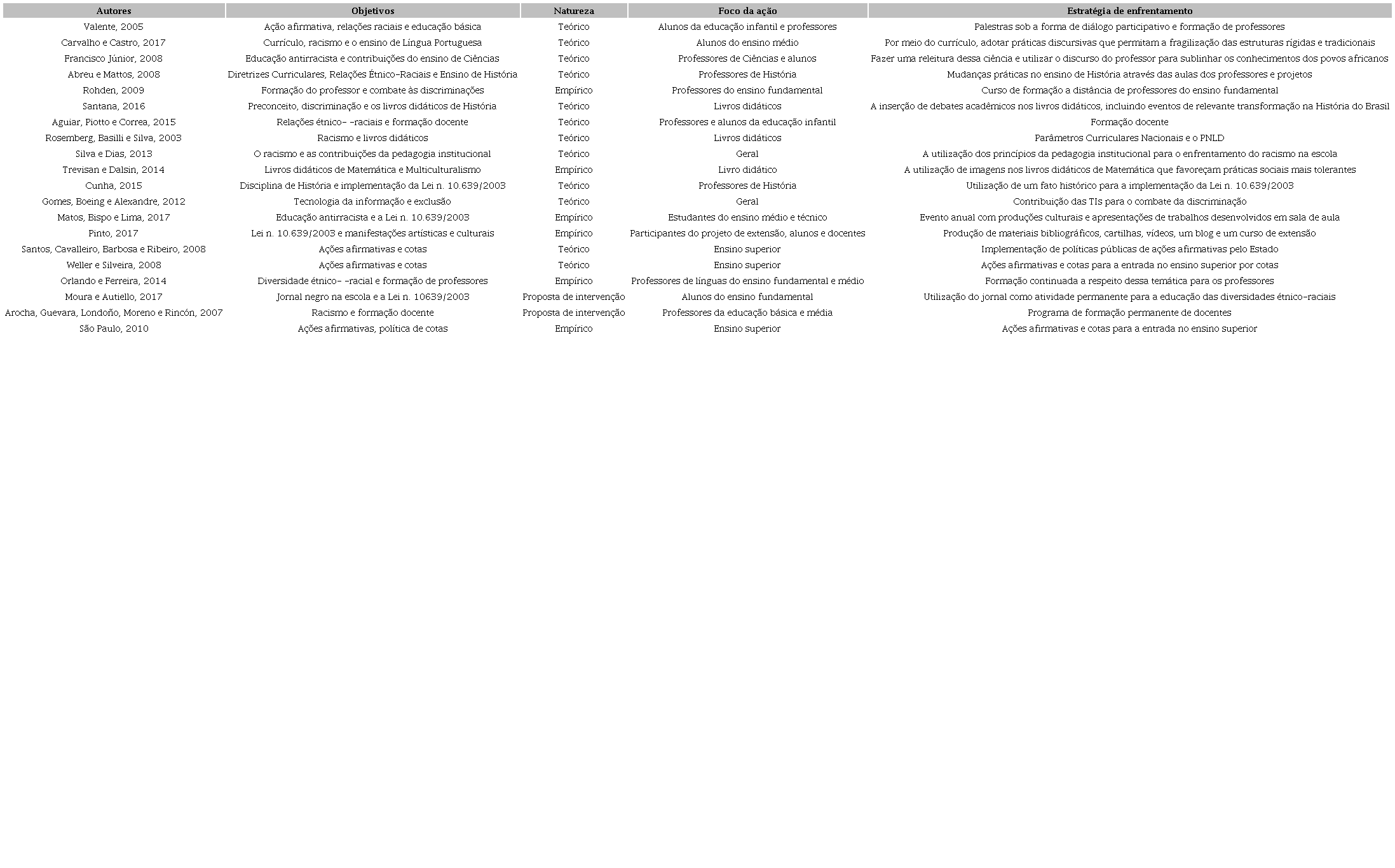 Para uma melhor exposição dos resultados encontrados, o conteúdo das estratégias de combate que apareceram nos artigos que compuseram esta revisão foi classificado em cinco categorias: contribuições do currículo e do ensino no combate ao preconceito; expressão do preconceito nos livros didáticos e estratégias de combate nesse contexto; estratégias de combate embasadas na formação docente; estratégias de combate embasadas nas políticas afirmativas e no sistema de cotas; e implementação da Lei n. 10.639/2003 como estratégia de combate.