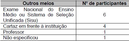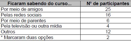 Perguntados sobre como eles(as) ficaram sabendo do curso de Pedagogia da instituição pesquisada, verificou-se que 25 souberam por meio de amigos, 16 pelas redes sociais, seis por parentes, quatro pela televisão ou outra mídia, 12 por outros meios e dois por dois meios diferentes, como ilustra a Tabela 1.