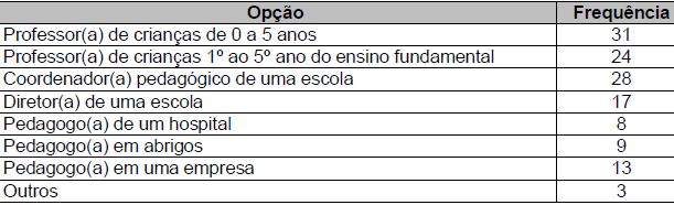 Uma vez que, de acordo com as Diretrizes Curriculares Nacionais para o curso de graduação em Pedagogia, licenciatura (Resolução CNE/CP nº 1/2006), o pedagogo é um profissional com a possibilidade de atuar em vários ambientes1, os(as) alunos(as) foram questionados(as) sobre a área em que pretendiam atuar. Muitos(as) só descobriram que o curso de Pedagogia permite trabalhar em vários ambientes após ingressarem no curso. Esse pode ser o motivo que levou 21 dos(as) respondentes a marcarem três ou mais opções quanto ao ambiente em que pretendiam atuar. Isso leva a refletir que esses(as) licenciandos(as) esperam que o curso lhes abra novas possibilidades de atuar em diversas áreas. A Tabela 3 apresenta a frequência da escolha profissional dos(das) participantes. Dos(as) três licenciandos(as) que assinalaram a opção “outros”, um(a) desejava trabalhar como professor(a) universitário(a), um(a) desejava trabalhar na secretaria de uma escola e um(a) desejava ser pedagogo(a) no Exército ou outra Força Armada.