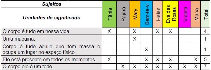 Para outra professora, “O corpo é tudo aquilo que tem massa e ocupa lugar no espaço”. Essa afirmativa foi da professora Bem-te-vi. Seus argumentos dizem respeito à existência do corpo como sendo algo visível, palpável e responsável pela comunicação com outrem.