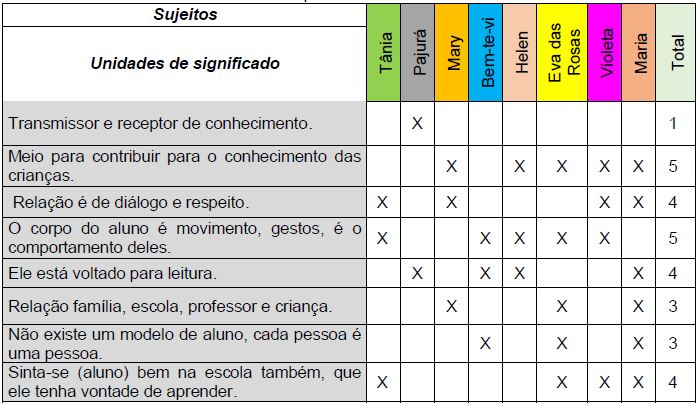 Nesse contexto, torna-se desafiador o exercício da prática docente, por isso as professoras, três delas especificamente, ao atribuírem sentido ao corpo, suscitaram duas unidades de significado de convergência: “Relação família, escola, professor e criança”; “Não existe um modelo de aluno, cada pessoa é uma pessoa”.