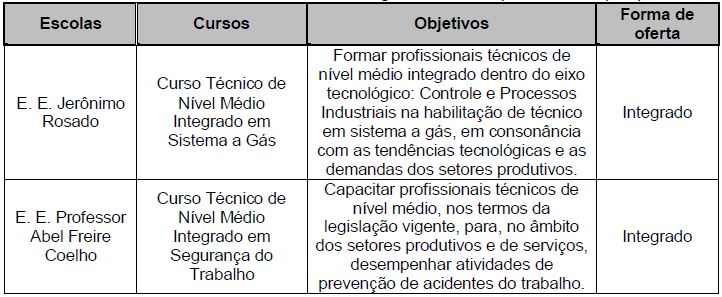 Na Escola Estadual Jerônimo Rosado, a proposta, ainda em processo de implementação do Curso Técnico de Nível Médio Integrado em Sistema a Gás, encontra--se inviabilizada por falta de professores para atuarem nas disciplinas específicas do núcleo de Educação Profissional. Já na Escola Estadual Professor Abel Freire Coelho, o Curso Técnico de Nível Médio Integrado em Segurança do Trabalho acontece na forma concomitante. Dessa maneira, a proposta de integração nas escolas estaduais ainda se caracteriza como um processo a ser realizado. Por se tratar de mais um programa de governo, não são poucas as limitações para que as ações dele decorrentes possam converter-se efetivamente em política pública educacional, pois os investimentos são principalmente para financiar a infraestrutura dos espaços escolares.