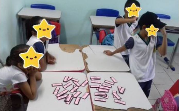 Nessa rodada, o grupo Brasil venceu mais uma vez. Em seguida, foi entregue a cada discente uma atividade relacionada aos jogos de Matemática (ver ilustração 13). As crianças consideraram a atividade fácil e a realizaram sem dificuldade. Como terminaram ao mesmo tempo, as duas equipes somaram pontos. O placar final foi o seguinte: 45 pontos para a equipe Brasil e 44 pontos para a equipe Mágica.