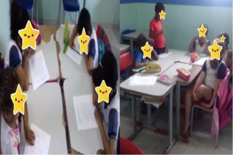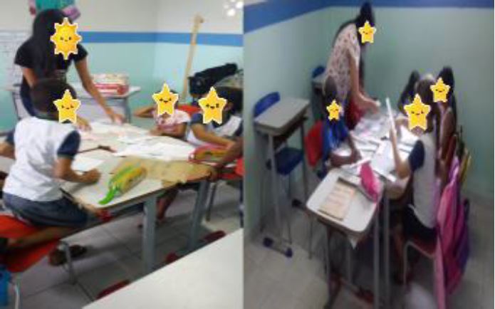 A EMEF Antônio Sinésio dos Santos – à qual, neste artigo, nos referimos como E1 – situa-se no Sítio Itamataí, em Pirpirituba-PB, onde as atividades tiveram início às 8h30 de um dia do mês de junho de 2018. Os integrantes do NEMDR já tinham estado, em 2017, nessa instituição intervindo mediante ações ligadas a projetos de ensino, pesquisa e extensão. No que se refere ao número de alunos da turma, anteriormente, por telefone, a professora da turma nos informou que havia 14 alunos, sendo quatro do 2º ano e dez do 3º ano. Quando chegamos à escola, ela nos acompanhou até a sala de aula, onde a equipe pôde conhecer seus discentes.