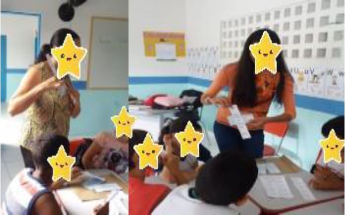 Durante cada jogo aplicado, os integrantes do NEMDR auxiliavam as crianças com relação a algumas dúvidas que surgiam enquanto realizavam a atividade. Por exemplo, valorizavam a importância e o modo/momento/maneira de corrigir um aluno que havia errado a grafia do vocábulo “massa” – ao grafar “massa” –, indo além de simplesmente informá-lo que deveria usar o dígrafo “ss”, como ocorre quando se segue a abordagem tradicional. Buscaram-se intervenções que se respaldassem no interacionismo, de forma a desafiar mais os estudantes das escolas com questionamentos que conduzam ao desequilíbrio cognitivo, valorizando a procura ativa por solucionar problemas que são significativos para eles. Desse ângulo, cabe ao profissional de educação planejar, executar e avaliar oportunidades de desenvolvimento de “ambientes cooperativos”, os quais, segundo Marques (2012, p. 42-43), são “estratégias para criar espaços de convivência saudáveis”, buscando: