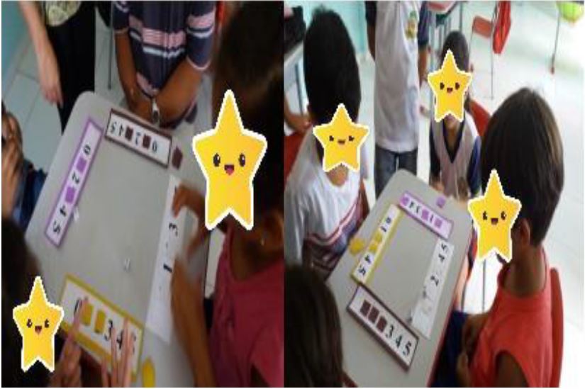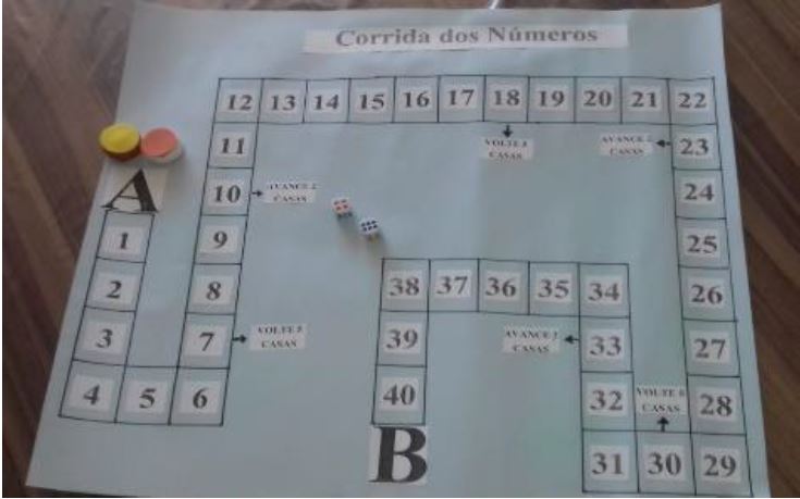Na escola E1, também foi desenvolvido o jogo Corrida dos Números, no qual é utilizada uma cartolina com uma trilha, a qual se inicia na letra “A” e se encerra na “B” (ver imagem 8). No decorrer do caminho/estrada, há 40 casas/trechos a serem percorridos. Dessa maneira, cabia a cada participante lançar dois dados ao mesmo tempo e, em seguida, realizar a operação de adição dos valores que ficaram na parte de cima de cada dado. O valor final resultante da soma representa a quantidade de “casas” que eles deveriam percorrer na trilha, numeradas de 1 a 40. Os passos de cada criança na trilha eram representados por meio de uma “tampinha” de garrafa. Saliente-se que havia também “trechos” da trilha nos quais se encontravam “ordens”, do tipo: “Avance 2 casas” ou “Volte 5 casas”.
