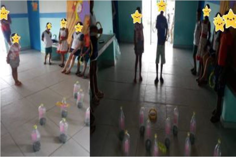 Na E1, os discentes também praticaram o Jogo das Argolas, como visualizado na ilustração 9. Utilizaram-se 10 garrafas PET, enumeradas de 0 a 9, e seis argolas, sendo três entregues a cada grupo. A atividade ocorreu no pátio. Para tanto, precisavam arremessar argolas para encaixá-las nas garrafas. Ganhava a equipe que conseguisse o maior número de pontos.