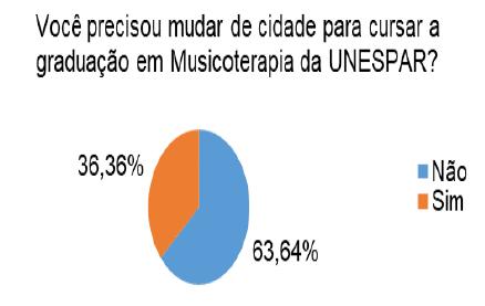 Existem apenas sete cursos ativos em nível de graduação em Musicoterapia no Brasil, com concentração nas regiões Sudeste, Sul e Centro-Oeste. Isso faz com que seja comum a mudança de cidade para o ingresso no curso. Contudo, as/os respondentes informaram que, em sua maioria (63,64%), não tiveram que mudar de cidade para realizá-lo (Gráfico 5). Vale refletir como a graduação de Musicoterapia promove uma espacialização geográfica, considerando a necessidade de mudança de cidade para a realização do curso por parte do corpo discente.