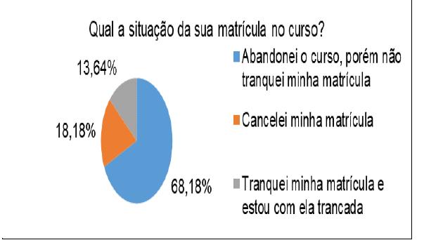A situação de matrícula no curso (Gráfico 6) aponta que a maioria das/dos respondentes (68,18%) abandonou o curso sem realizar o trancamento ou o cancelamento de matrícula. Esta certamente é uma temática sensível que merece atenção. Apesar de o Brasil ser reconhecido pelo excesso de trâmites burocráticos, tanto na esfera pública quanto na privada, a ação de abandonar o curso sem trancamento de matrícula ou cancelamento desta impacta diretamente o quadro de vagas ofertadas pela instituição para portadoras/es de diplomas.