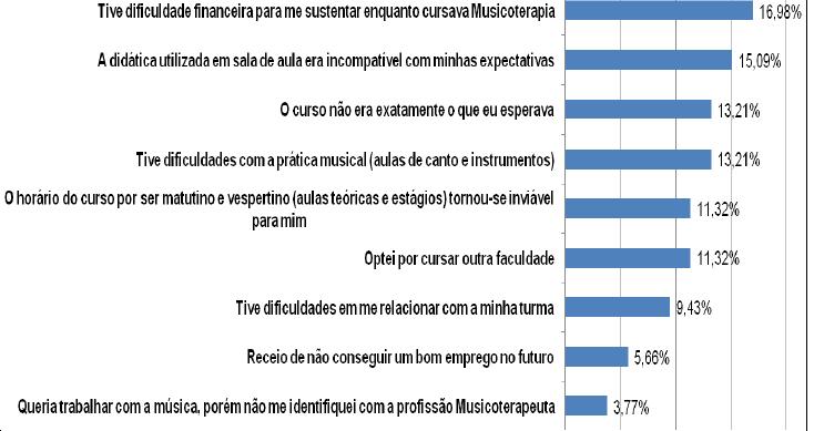 Como quinta motivação, com 9,43% das respostas, figurou a opção “Tive dificuldades em me relacionar com a minha turma”. A opção “Receio de não conseguir um bom emprego no futuro” figurou em sexto lugar, com 5,66% das respostas. E a opção “Queria trabalhar com música, porém não me identifiquei com a profissão musicoterapeuta”, em sétimo lugar, com 3,77% das respostas. As outras cinco opções disponíveis nessa questão não figuraram como resposta para as/os respondentes.