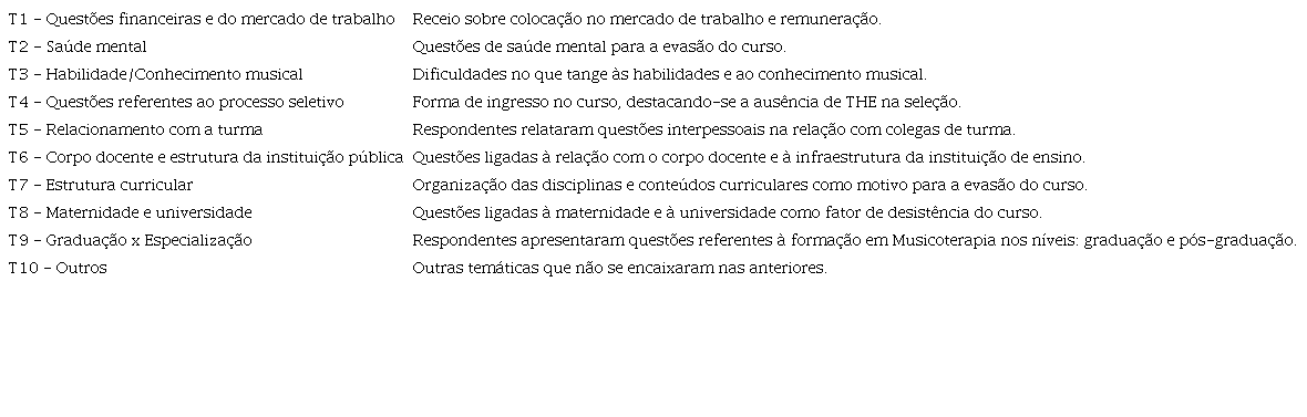Algumas das categorias temáticas que emergiram após a leitura da questão aberta já haviam sido contempladas nas motivações anteriores, por exemplo, as categorias T1 (Questões financeiras e do mercado de trabalho), T3 (Habilidade/ Conhecimento musical), T4 (Questões referentes ao processo seletivo), T5 (Relacionamento com a turma) e T7 (Estrutura curricular).