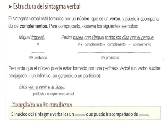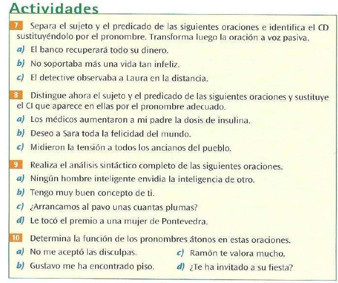 A pesar de lo especificado, en los manuales revisados abundan ejercicios consistentes en la mera catalogación de fenómenos gramaticales, que en absoluto responden a una reflexión sobre el funcionamiento de la lengua y menos aún al desarrollo de habilidades lingüístico-comunicativas. Contrariamente, la actividad del alumno suele consistir en un mero ejercicio memorístico de términos y conceptos y en la identificación de determinados elementos, tal y como se demuestra, además, con la constante presencia en estos manuales de ejercicios individuales en los que solo hay que señalar diversos elementos sintácticos, tales como el sujeto, el predicado y otras funciones. Esa concepción didáctica de la gramática es achacada por Camps (2014, p. 10) a la influencia de los modelos formales de la lingüística del siglo XX. El mismo modo en el que se enuncian las actividades (con verbos como detectar, encontrar, etc.) predispone al alumno a la aplicación mecánica de una serie de saberes aprendidos sin reflexión alguna ni vinculación con el significado. Hay múltiples ejemplos en todos los manuales, pero veamos el siguiente (Imagen 1):