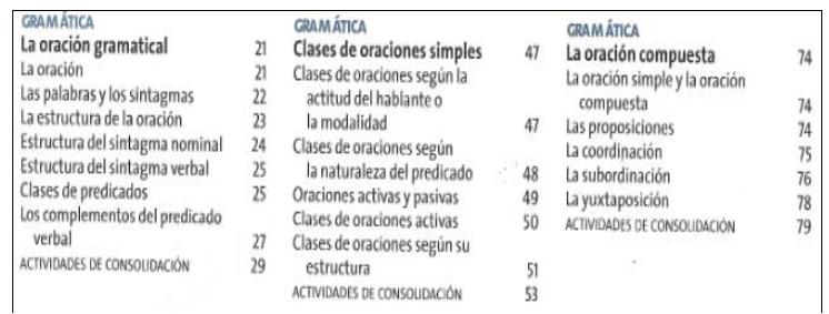 No pasa desapercibido que la organización de los contenidos gramaticales en estos manuales obedece al estudio tradicional de las oraciones en un temario clásico, al centrar el interés individualmente en el nivel oracional (no se establece relación alguna con el texto o discurso), como puede observarse en el siguiente fragmento de un índice (Imagen 3):