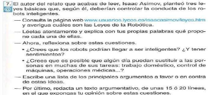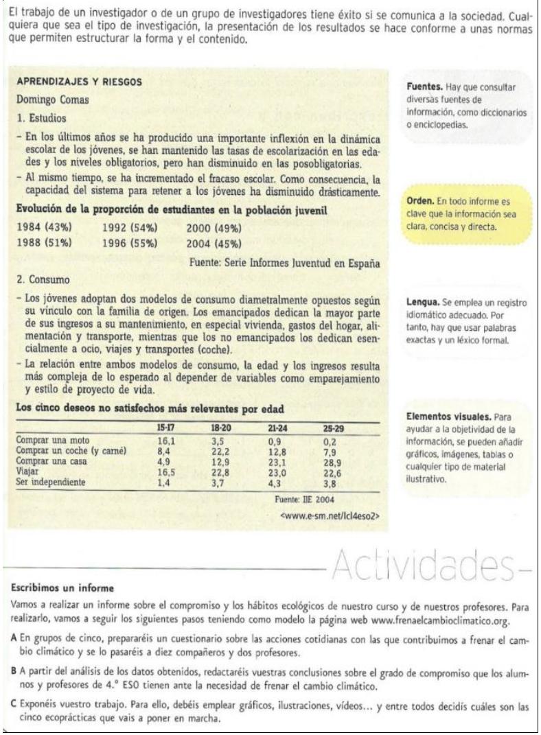 Esto es debido a que, a pesar de que, a partir de la reforma de los años 90, se introdujeron aspectos provenientes de la Lingüística del texto, no se ha hecho más que incrementar la carga de contenidos gramaticales (ZAYAS, 2011, p. 93). Salvo por algunos ejercicios aislados en los que se plantea un atisbo de que el alumno aprenda por descubrimiento, los libros analizados presentan una concepción del aprendizaje donde el alumno no es el protagonista, sino el receptor y mero repetidor de lo que el profesor enseña, y carente de todo tipo de reflexión. No se proponen actividades que fomenten el aprendizaje colaborativo, para favorecer un aprendizaje social, ni tan siquiera en aquellas ocasiones en que parecería oportuno hacerlo. Véase el ejemplo en la Imagen 4 donde acertadamente se propone una actividad de búsqueda de información en la que deben desarrollarse las destrezas escritas: