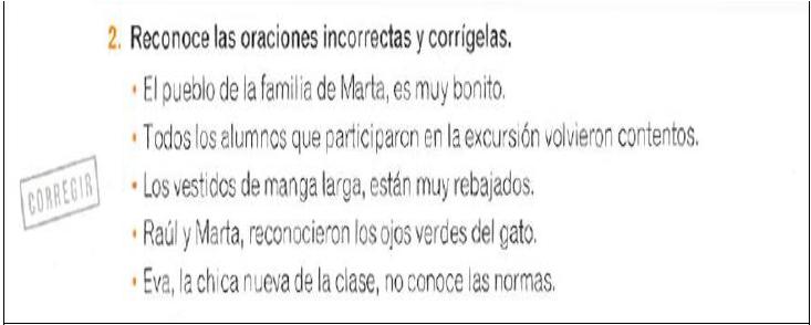 Otro de los aspectos interesantes que sirve para comprobar cómo fomentan los libros la reflexión lingüística es el análisis de las actividades propuestas para trabajar el error. Y, en tal caso, hemos observado pocas actividades encaminadas a este fin, que una vez más operan exclusivamente en un ámbito descontextualizado donde no se trabaja la oración dentro del texto, como el caso de la Imagen 6: