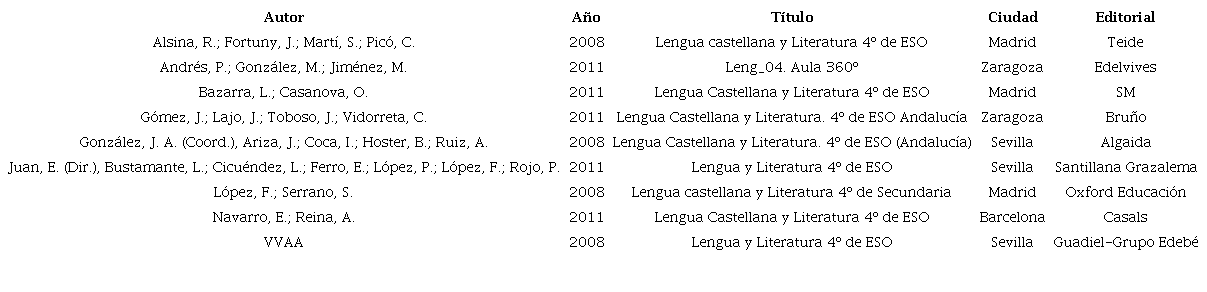 Nuestro estudio partirá del análisis de un total de nueve libros de texto de 4º curso de Educación Secundaria Obligatoria de diferentes editoriales y autores, todos ellos usados en un total de 20 centros de enseñanza públicos y privados de la ciudad de Sevilla, que son objeto de una investigación mayor completada con el estudio de las creencias de parte de su profesorado (n=20) y alumnado (n=447). Esos otros elementos de la triangulación son tratados en otra publicación y aquí nos centraremos en el análisis de los libros de texto. Partiendo del modo de proceder de otros trabajos que en los últimos años han centrado también su análisis en los libros de texto y su uso en la enseñanza de la lengua (FERRER, 2015; GIETZ, 2019; JIMÉNEZ FERNÁNDEZ, 2011; RIBAS, 2010, entre otros), esta investigación centra su atención en la siguiente muestra de materiales docentes (a las que en adelante haremos alusión por el nombre de la editorial):