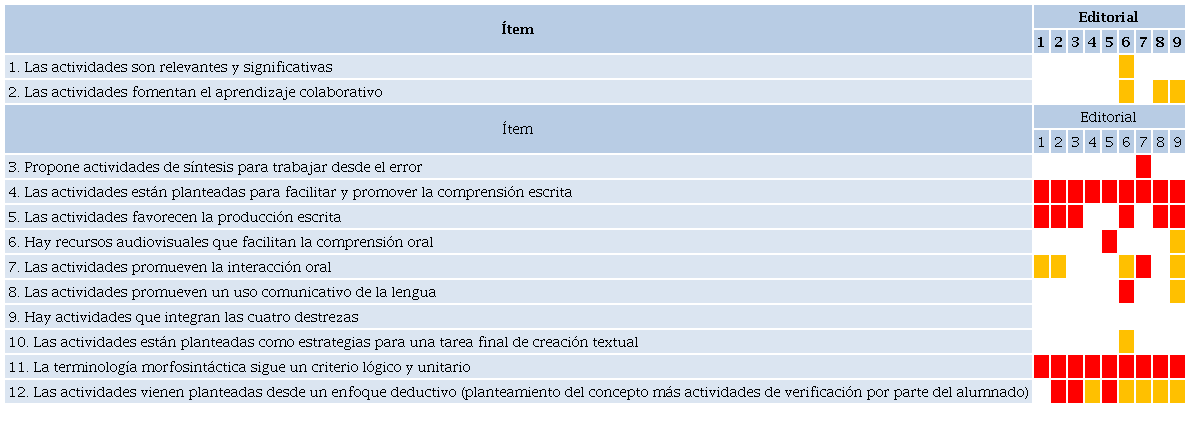 Por último, en la Tabla 2 establecemos una comparativa de los diferentes libros de texto, en la que recopilamos todos los aspectos que hemos tenido en cuenta para el análisis de las actividades propuestas por los manuales mediante una rúbrica de evaluación: