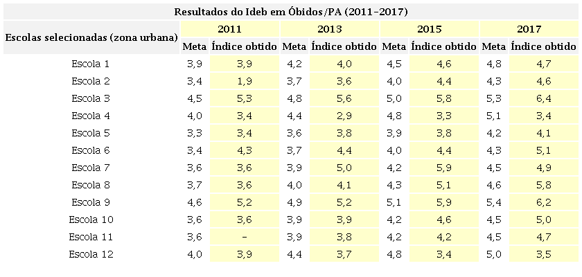 Inclusas nesse sistema, as escolas recebem uma nota de desempenho. No Quadro 1, apresenta-se um panorama das escolas de Óbidos/PA: