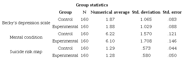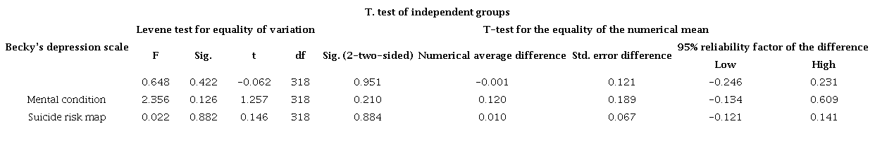 The difference between the two independent groups is given in the Sig (2-tailed) column in table 3.5, and as can be seen, there was no P≤0.05 on any variable. So the difference between the groups at 0.05 is not significant. As we know, when it is P≤0.05, the claim that the intergroup difference is significant at 0.05 is confirmed. However, it cannot be said that the difference between the two groups is serious and statistically significant. In our example, “Becky’s depression scale” is p = 0.951, “Mental Change” is p = 0.210, “Suicidal risk map” is p = 0.884.