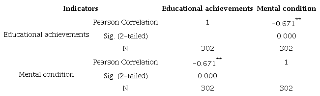 As can be seen from Table 4, there is an inverse relationship between students’ learning achievements and mental state, that is, p = 0.000, r = -0.671. When the indicators of mental state are inadequate, the level of students' learning achievements decreases.