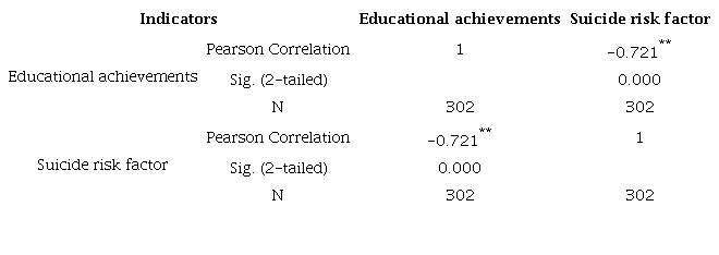 As can be seen from table 5, any fail in students’ educational achievements increases their risk factor of suicide, that is, p = 0.000, r = -0.721.
