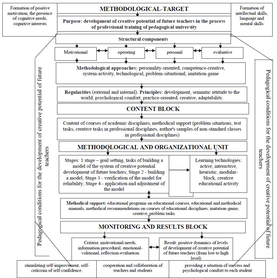 The methodological and target block of the model is represented by the unity of purpose, structural components of the creative potential of future teachers, methodological approaches, patterns and principles of teaching. The purpose of the proposed model is to ensure the holistic systematic development of the creative potential of future teachers in the system of the pedagogical university.