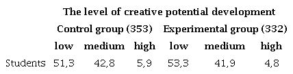 The developed model and experimental verification of its effectiveness led to the formative stage of the experiment, the purpose of which was: experimental verification of the effectiveness of the introduction of the developed model of the system of creative potential development of future teachers, which operates in specially created pedagogical conditions.