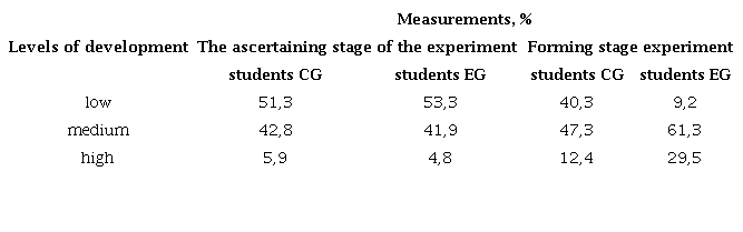 The dynamics of the levels of development of creative potential of future teachers according to the results of the control stage of the experiment on the implementation of certain pedagogical conditions are presented in table. 2., which shows that the process of its development in compliance with a set of pedagogical conditions was much more successful in the program of research training and provided growth of its level in a positive direction from low to medium and high in the experimental groups.