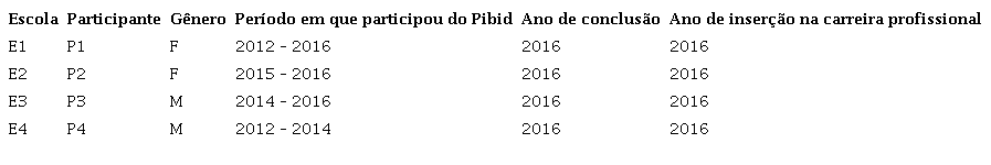 O ingresso na carreira profissional dos participantes do estudo ocorreu em 2016, um ano antes do desenvolvimento da pesquisa. Para Huberman (2000), a fase de início de carreira corresponde aos três primeiros anos de docência, por essa razão pode-se classificá-los como professores iniciantes.