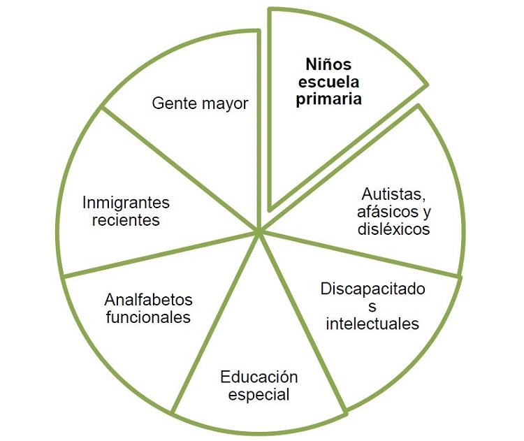 En España, el método de LF es relativamente nuevo. Desde el año 2002, la Asociación Lectura Fácil trabaja para hacer accesible la lectura, la cultura y la información a todas las personas, con especial atención a aquellas con dificultades lectoras y de comprensión – como pueden ser personas con alguna discapacidad intelectual, ancianos, población inmigrante reciente o alumnos de Educación Primaria, entre otros colectivos (Figura 1), “[...] mediante la aplicación de un conjunto de recomendaciones o pautas lingüísticas y ortotipográficas a las que deben atenerse los materiales creados al amparo de dicho concepto” (ANULA, 2005, p. 4).