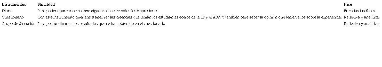 Por otra parte, los instrumentos utilizados para esta investigación fueron el diario, el cuestionario y el grupo de discusión (Tabla 1).