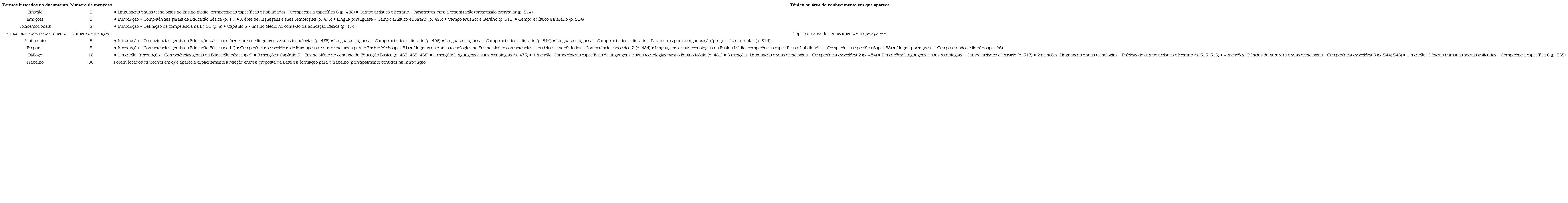Para compreender melhor como as habilidades socioemocionais comparecem na BNCC para o Ensino Médio, foi realizada inicialmente uma busca por palavras e, em seguida, a análise sobre os assuntos aos quais estão relacionadas, chegando-se aos seguintes resultados: emoção (duas menções), emoções (cinco menções), socioemocionais (duas menções), sentimento (quatro menções), empatia (cinco menções). Eles são usados nos seguintes contextos: definição das competências 2, 6 e 8, definição de BNCC, sobre o campo artístico e literário, na parte de linguagens e suas tecnologias, sobre a Educação Física e na contextualização do Ensino Médio na Educação Básica.