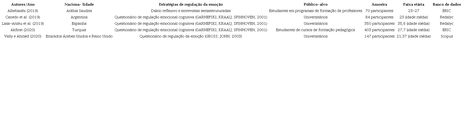 Como pode ser visto no Quadro 1, apenas dois artigos foram sobre regulação da emoção de estudantes de cursos de formação de professores. Outros três trabalhos com participantes estudantes universitários foram localizados. Todos os artigos encontrados eram internacionais. Ressalta-se que pesquisas brasileiras sobre as estratégias de regulação emocional de estudantes de cursos de formação de professores ou universitários não foram identificadas no recorte temporal. O público-alvo e o número total de participantes, bem como a faixa etária e o banco de dados onde os estudos foram localizados, também são descritos.