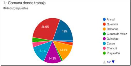 Caracterização da amostra: a maioria dos professores trabalha em áreas urbanas, com uma taxa de participação de 52,4%. Com relação à comuna de residência, participaram professores das dez comunas da Província, sendo a amostra distribuída em porcentagens, como mostra o Gráfico 1.