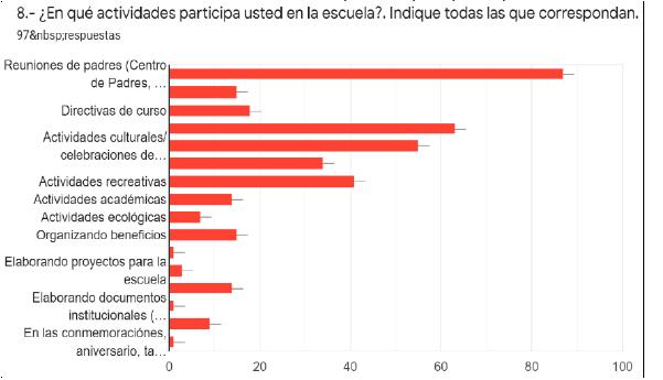 As reuniões de pais são as atividades mais frequentadas e o envio de comunicações escritas são os canais de informação mais tradicionais, assim como as atividades festivas e artístico-culturais. Entretanto, as atividades de treinamento ou oficinas para pais são esporádicas e as escolas não têm atividades institucionalizadas que promovam o fortalecimento das habilidades parentais, uma situação semelhante que ocorre em outros contextos, de acordo com o estudo realizado por Barrientos (2015).