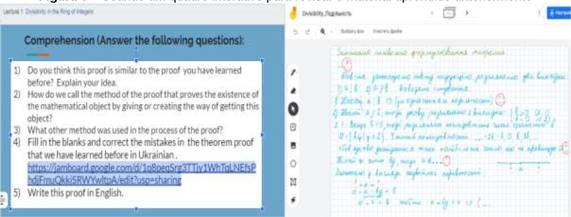 Consideramos como essas técnicas foram implementadas no desenvolvimento do suporte educacional para a palestra “Divisibilidade no anel dos inteiros”. Os discentes repetem previamente os conceitos básicos e as propriedades de divisibilidade de inteiros conhecidos por eles. Durante a palestra, é aconselhável repeti-los na forma de uma nuvem interativa de palavras. A formulação do teorema da divisão com resto merece mais atenção. Ao mesmo tempo, novas unidades lexicais de conteúdo matemático são introduzidas. A introdução de novas unidades lexicais envolve a percepção da fala oral (escuta) e escrita (leitura). Como resultado da introdução de novas unidades lexicais, os alunos consideram e comentam uma nova nuvem interativa de palavras, composta por termos matemáticos conhecidos em inglês. Ao elaborar materiais didáticos para palestras, é necessário considerar as possibilidades das mais recentes tecnologias educacionais, as oportunidades das TICs para apoiar o processo educacional, que têm um impacto significativo na AIML. Eles nos permitem diversificar as formas de interação dos participantes (alunos, professores e o ambiente educacional moderno). O modelo de aprendizagem combinada nos permite perceber essas possibilidades de novas TICs modernas. Esse modelo de ensino e aprendizagem permite (VELYCHKO et al., 2020) tirar vantagem do ensino presencial e dos recursos educativos eletrônicos através de uma combinação de comunicação a distância e tradicional em atividades de aprendizagem integradas. A integração da aprendizagem tradicional e baseada em computador levará a uma aquisição intencional de conhecimentos, habilidades e competências em sala de aula e atividades de aprendizagem extracurriculares através do uso das TICs. A existência dessa forma de aprendizagem é possível devido à combinação efetiva de diferentes formas de apresentação de conteúdos educacionais, modelos e estilos de ensino. Baseia-se na interação entre todos os participantes do processo educacional. Esses aspectos devem ser tidos em conta na concepção e desenvolvimento do material didático para as aulas da disciplina “Matemática em língua estrangeira (elementos da teoria dos números e teoria da congruência)” na AIML. Portanto, sugerimos a inclusão de exercícios interativos criados com a ajuda de LearningApps. A próxima etapa na formação e desenvolvimento das habilidades linguísticas é trabalhar com o texto, no nosso caso, com a prova do teorema da divisão com resto. Mostramos para consideração uma variante de prova que difere da estudada anteriormente em alguns aspectos, embora o método geral de prova (prova construtiva) permaneça semelhante ao estudado anteriormente pelos alunos. As formas de organização deste trabalho incluem o trabalho em duplas (ler e discutir), em minigrupos e em grupo (ler e conversar sobre a ideia principal da determinada etapa da prova). O exercício é usado para controlar a compreensão da leitura. Ao mesmo tempo, a implementação da tarefa 4 fornece alguma ajuda aos alunos que utilizam a técnica de apoio. Envolve a aplicação do conhecimento prévio dos estudantes para provar o teorema em sua língua nativa, usando um quadro interativo Jamboard (Fig. 1).