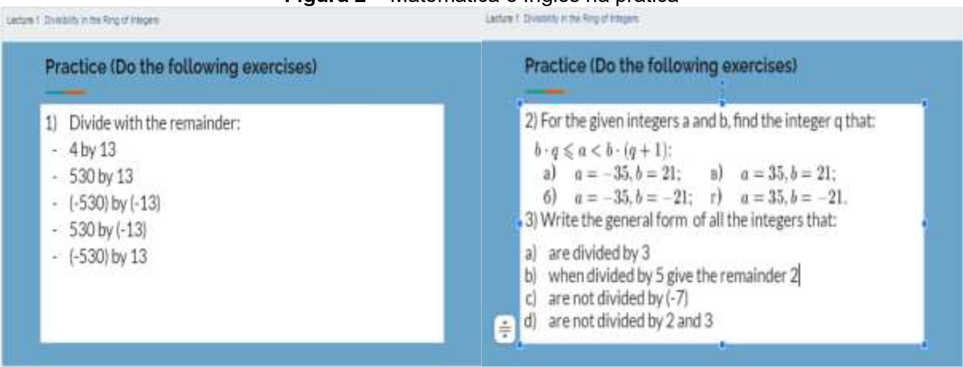 Para garantir as atividades matemáticas que as acompanham, formulamos tarefas (Fig. 2) em inglês para aplicar na prática os conhecimentos matemáticos e linguísticos obtidos. As tarefas são realizadas pelos discentes na atividade coletiva sob supervisão e com a ajuda do professor. A etapa final da palestra, em nossa opinião, envolve a transferência de conhecimentos e habilidades adquiridas dos discentes para novas condições. Para isso, apresentamos trabalhos criativos aos estudantes em duplas ou minigrupos. Essas atividades abrangem o desenvolvimento de habilidades de agrupamento de conceitos e fatos matemáticos por meio do inglês, usando a abordagem Brainstorm. Dessa forma, a formação da flexibilidade, como uma qualidade necessária da habilidade linguística, é assegurada.