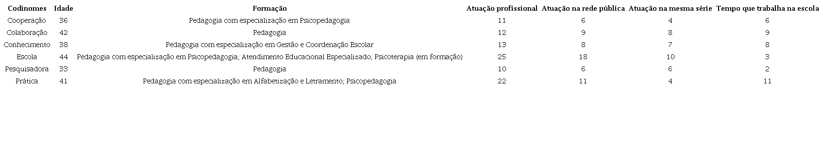 A pesquisa foi desenvolvida com seis professoras da rede municipal de educação de Feira de Santana. As entrevistas foram realizadas de modo remoto, utilizando a plataforma Google Meet. As entrevistas duraram em média de 40 a 60 minutos, sendo gravadas, transcritas e apresentadas às colaboradoras para validação. Os nomes são fictícios, criados pelas próprias colaboradoras. Trata-se de nomes que elas mesmas se atribuíram por verem em si alguma característica. Assim, os nomes referem-se às características que elas próprias enxergam em si. As identidades não foram reveladas em função de cumprir as orientações do Comitê de Ética em Pesquisa que aprovou o referido estudo.