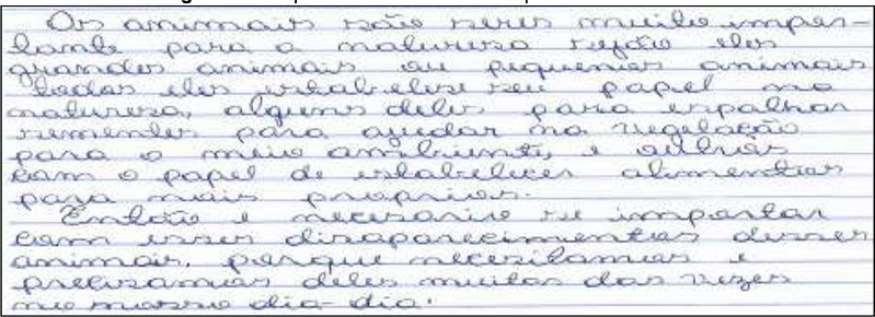 A análise nos permite concluir que, nesse caso, além da condição de animais colaboradores “para espalhar sementes”, o estudante faz referência aos “grandes animais ou pequenos animais”, o que representa um aspecto importante, visto que normalmente os alunos exemplificam apenas animais de maior porte. Outro aspecto apontado refere-se às relações alimentares que podem ser estabelecidas entre os animais, o que nos remete a uma referência ao conceito de cadeia alimentar, sem deixar de ressaltar a necessidade de “[...] se importar com esses disaparecimentos, porque necesitamos e precisamos deles muitas das vezes no nosso dia-dia”.