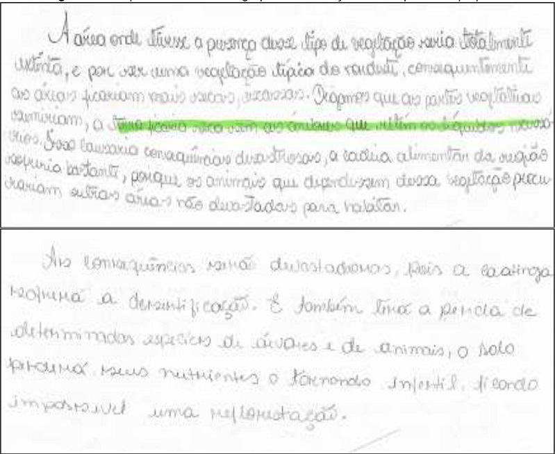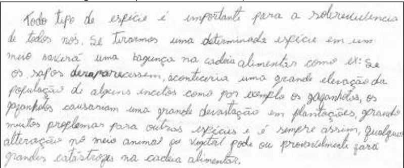 Analisando a resposta apresentada, entende-se que “haverá uma bagunça” faz referência a um desequilíbrio, que, nesse caso, implica a diminuição e aumento de populações animais e vegetais. Além disso, a frase “gerando muitos problemas para outras espécies” demonstra a percepção desse estudante sobre a importância de se manter a unidade nas cadeias alimentares, sob o risco de ocasionar “problemas para outras espécies”.