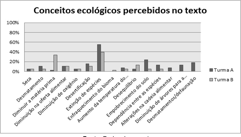 Com as análises, verifica-se, de modo geral, que alterações na cadeia alimentar, diminuição de árvores para a produção da fotossíntese, desmatamento e redução da fauna foram termos que apareceram unicamente nas respostas da turma A (grupo de intervenção), o que aponta uma maior preocupação para as questões ecológicas e expressão de maturidade leitora conquistada a partir da leitura proposta. As respostas apresentadas pelos alunos da turma B (grupo de observação participante) limitaram-se às informações fornecidas pela questão disponibilizada para os estudantes, sem ampliar outras possibilidades de hipóteses, críticas e posicionamentos diante do problema apresentado.