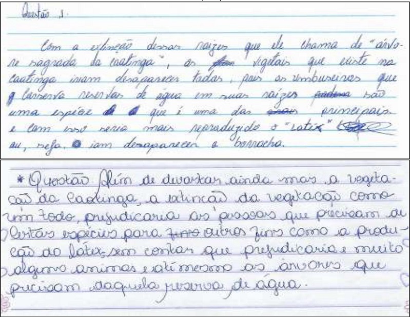 Dentre as respostas emitidas pelos alunos da turma B (grupo de observação participativa), foi possível perceber uma preocupação com a diminuição de matéria- -prima da caatinga, vinculando essa diminuição com a falta de material para a produção de bens de consumo. No entanto, pouco se falou sobre proteção, preservação, causas e consequências da extinção de uma espécie (Figura 5), assim como apresentado no trabalho de Fernandes, Silva e Araújo (2020), que, ao verificar o entendimento de estudantes sobre o funcionamento dos ecossistemas, mostrou que as respostas foram influenciadas pela percepção ambiental do sujeito em seu cotidiano e pelo pouco conhecimento a respeito de ecologia e de relações entre os seres vivos e o meio ambiente.