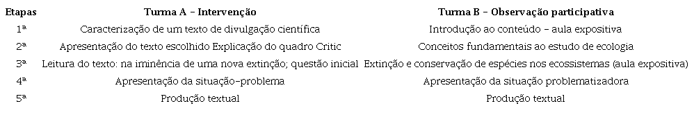 Na turma de intervenção, o conteúdo foi abordado por meio de textos de divulgação científica, enquanto o mesmo conteúdo foi abordado de maneira tradicional (aulas expositivas) na turma de observação participativa, seguindo uma metodologia normalmente utilizada para o desenvolvimento das atividades bimestrais. As etapas metodológicas vivenciadas nas duas turmas estão detalhadas no Quadro 1.