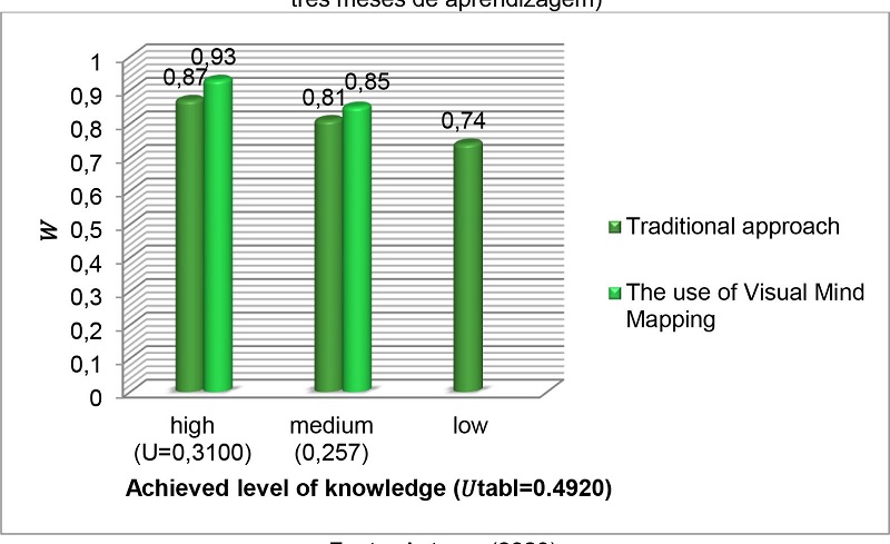 Após a formação, os alunos determinaram uma abordagem de aprendizagem, o que contribuiu para a construção de competência profissional durante o estudo de uma língua estrangeira. O período de três meses foi levado em consideração durante o estudo. Para isso, foi feita uma comparação entre o sistema de treinamento utilizado anteriormente e o treinamento com uso de Visual Mind Mapping. Os resultados foram obtidos pelo cálculo do coeficiente de concordância (Figura 2).