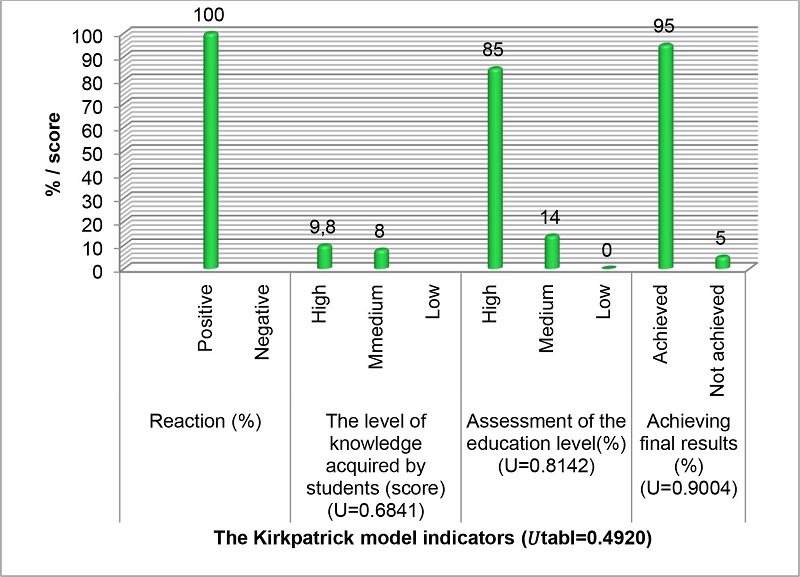 O modelo Kirkpatrick foi utilizado para estabelecer que a reação dos alunos ao processo de aprendizagem foi positiva (100%), o que está relacionado com a garantia da independência da aprendizagem. Esta abordagem de aprendizagem também promove o estudo aprofundado de informações que desenvolvem a competência dos alunos em línguas estrangeiras. Os resultados mostraram que a maioria dos alunos adquiriu um alto nível de conhecimento durante os estudos, o que influenciou no futuro da atuação profissional. Utilizando o modelo Kirkpatrick, constatou-se que 95% dos alunos acreditam que os resultados esperados foram alcançados.