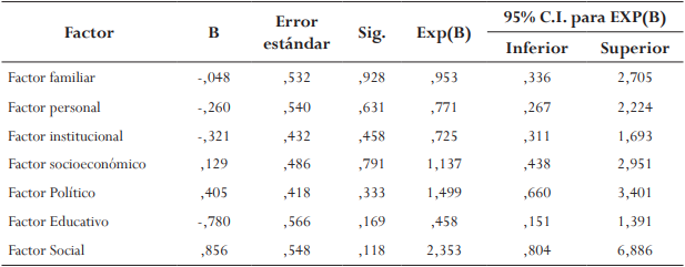 Debido a que la significancia (p. valor o Sig.) es mayor al valor α (margen de error al ,005) en todos los indicadores del factor, no se rechaza la hipótesis nula. Por consiguiente, no se presentan diferencias significativas en los indicadores del factor político. En respuesta al objetivo específico 5, el indicador perdido de la instrucción pre-militar en los colegios (B = -0,681) presenta mayor coeficiente y por ende provoca la delincuencia juvenil, este indicador del factor político presenta un odds ratio (Exp(B)) = 0,506, significando que es un indicador de protección, como hechos preventivos si los jóvenes tuvieran instrucción pre militar centrada en la disciplina y respeto se evitaría la delincuencia juvenil (tabla 6).
