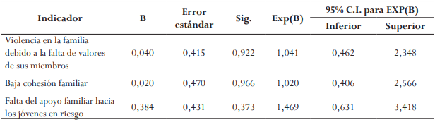 Debido a que la significancia (p. valor o Sig.) es mayor al valor α (margen de error al ,005) en todos los indicadores, no se rechaza la hipótesis nula. Por consiguiente no se presentan diferencias significativas entre los indicadores del factor familiar, no obstante para dar respuesta al objetivo específico 1; el indicador que origina la delincuencia juvenil es la falta del apoyo familiar hacia los jóvenes en riesgo (B = 0,384), ya que evidencia mayor coeficiente dentro del factor familiar, este indicador presenta un odds ratio (Exp(B)) = 1,469, que significa un indicador de riesgo, por consiguiente es fundamental la prevención en las familias, específicamente la comunicación entre padres e hijos, el tiempo que los padres dedican en la atención a sus hijos (tabla 2).