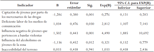 Debido a que la significancia (p. valor o Sig.) es menor al valor α (margen de error al ,005) en cuatro de los indicadores del factor, se rechaza la hipótesis nula. Por consiguiente, existen diferencias en los indicadores del factor socioeconómico que provocan a la delincuencia juvenil, en respuesta al objetivo específico 4 el indicador influencia negativa de jóvenes que pertenecen a bandas violentas (B = 1,502) presenta mayor coeficiente y, por tanto, provoca la delincuencia juvenil. De la misma forma, este indicador del factor socioeconómico presenta un odds ratio (Exp(B)) = 4,490, que significa un indicador de riesgo, los jóvenes se encuentran vulnerables, ya que por falta de dinero inician a delinquir por las órdenes o influencias de amistades negativas (tabla 5).