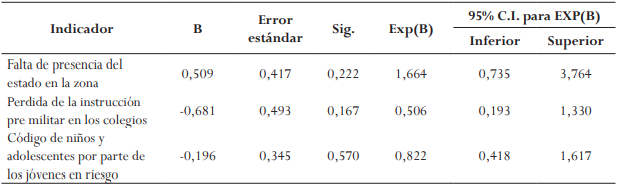 Debido a que la significancia (p. valor o Sig.) es menor al valor α (margen de error al ,005) en dos de los indicadores del factor, se rechaza la hipótesis nula. Por consiguiente, se presentan diferencias significativas en los indicadores del factor institucional que provoca la delincuencia juvenil. En respuesta al objetivo específico 3, el indicador que predomina es la falta de prácticas continuas de prevención (B = -2,515) ya que presenta mayor coeficiente y por ende provoca la delincuencia juvenil, esto en el factor instituciona; este indicador presenta un odds ratio (Exp(B)) = 0,081, significando que es un indicador de protección, que quiere decir que si se establece acciones preventivas desde las instituciones públicas y privadas, de manera constante, se disminuiría la delincuencia juvenil (tabla 4).