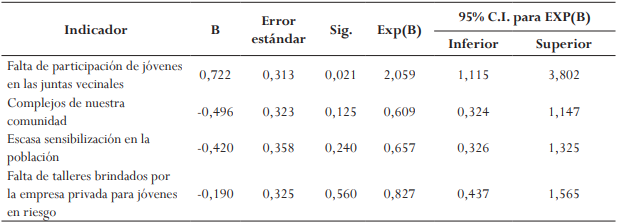 El factor social presenta el indicador de falta de participación de jóvenes en las juntas vecinales como el indicador predominante con un valor de B = 0,722. Este indicador demuestra un coeficiente mayor, y por tanto, provoca la delincuencia juvenil con un odds ratio (Exp(B)) = 2.059, que significa un indicador de riesgo. Este resultado entra en contraste con lo hallado por Lara (2015), quien argumenta que las acciones realizadas por la policía nacional y todos los elementos relacionados con el freno de la delincuencia juvenil están en relación directa con el aprecio de la comunidad. Esto significa que los pobladores presentan un fuerte sentido de identificación y se involucran en distintos organizaciones e instituciones creadas con el propósito de la erradicación de problemas sociales como la delincuencia juvenil. La participación en grupos sociales, juntas vecinales o voluntariado con objetivos a favor de la sociedad, contribuye en la formación de la persona y con ello evitaríamos que algunos jóvenes se inserten en la delincuencia.